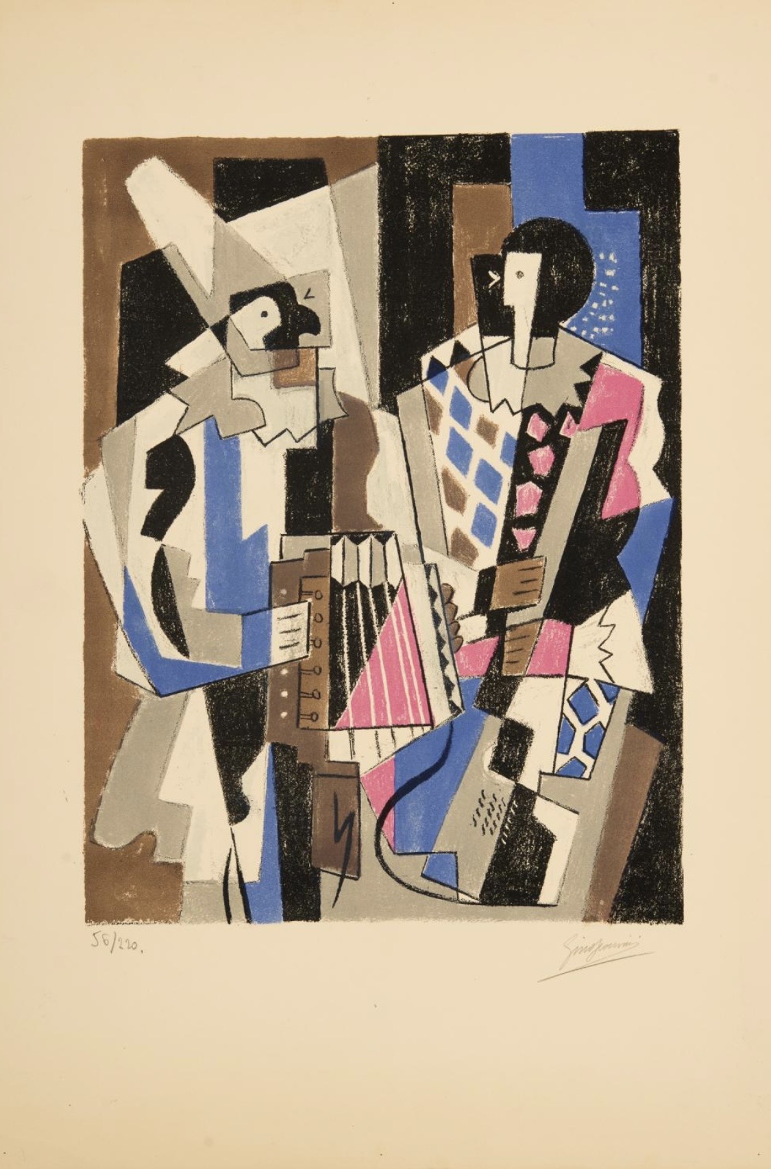 Gino Severini (1883-1966) – Kleurenlithografie ‘Les Arlequins’ – 1954. Uitv.: La guilde de la gravure; Pully-Lausanne. Gesigneerd in potlood. Opl.: 56/220. Afm.: 561 x 382 mm. Ingelijst achter museumglas.